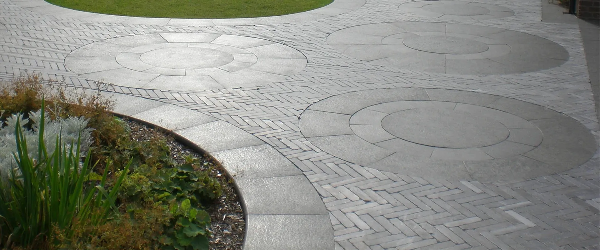 The project uses different colors basalt stone products, some in dark, and some in gray. All the pavings are in flamed+brushed finish. cobble stone in tumbled finish. Most of the paving stone are in circle design. They make the house look quaint.