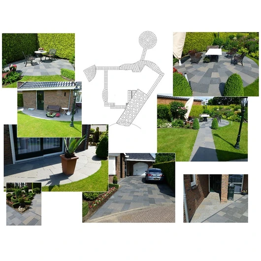 This project is also located in Europe. most of the paving stone are in circle design. all the paving stones are in customized size. Black and grey basalt stone are mixed. Finish is flamed+brushed, edges are with small bevel.